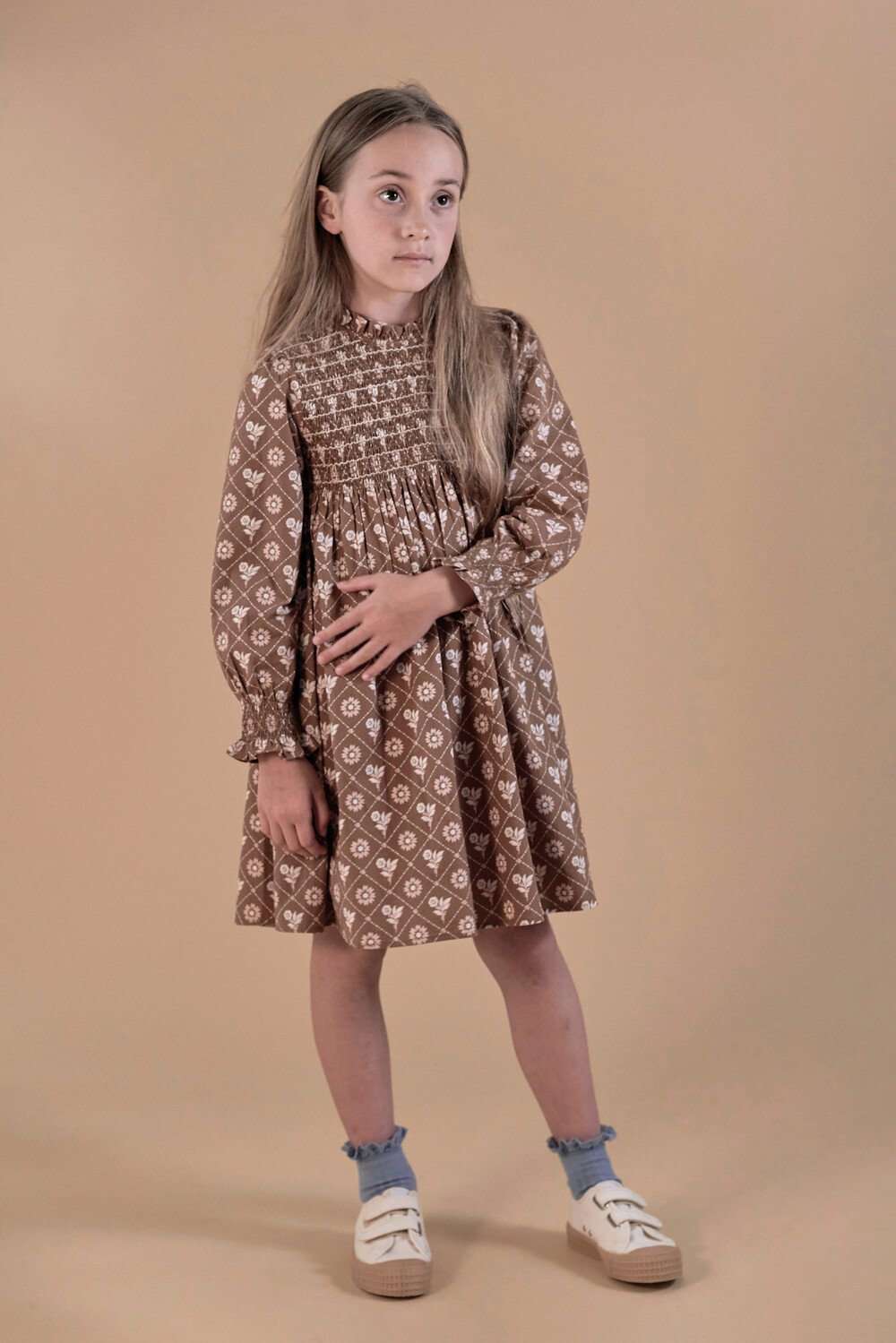 In the season’s folk-inspired loaf tin floral print, the beautiful Mia dress has a modern vintage mood. Mia makes a statement with her hand-smocked upper body in contrast cream, frilled neck and voluminous sleeves. The ideal dress for cool kids on easy autumn days, we love Mia paired with knee high socks and Mary-Janes. Invisible zip closure to back.