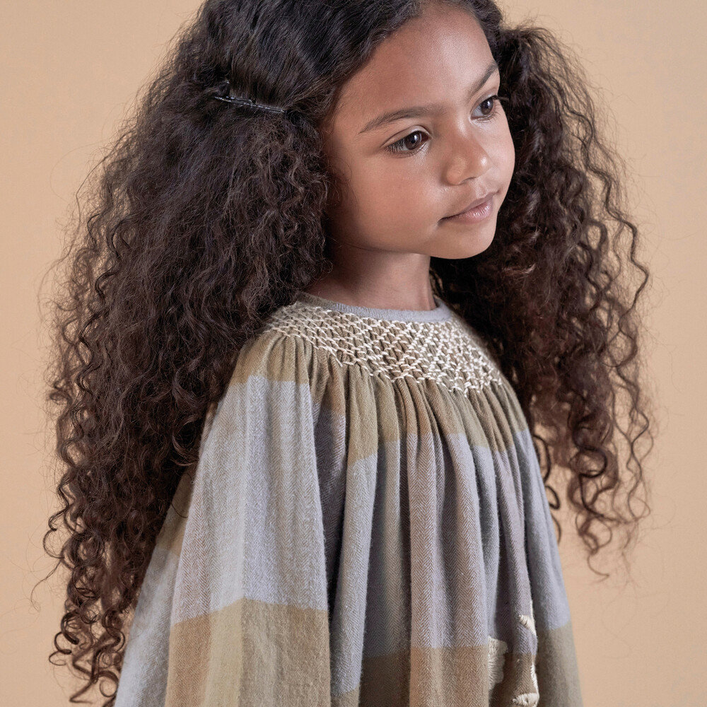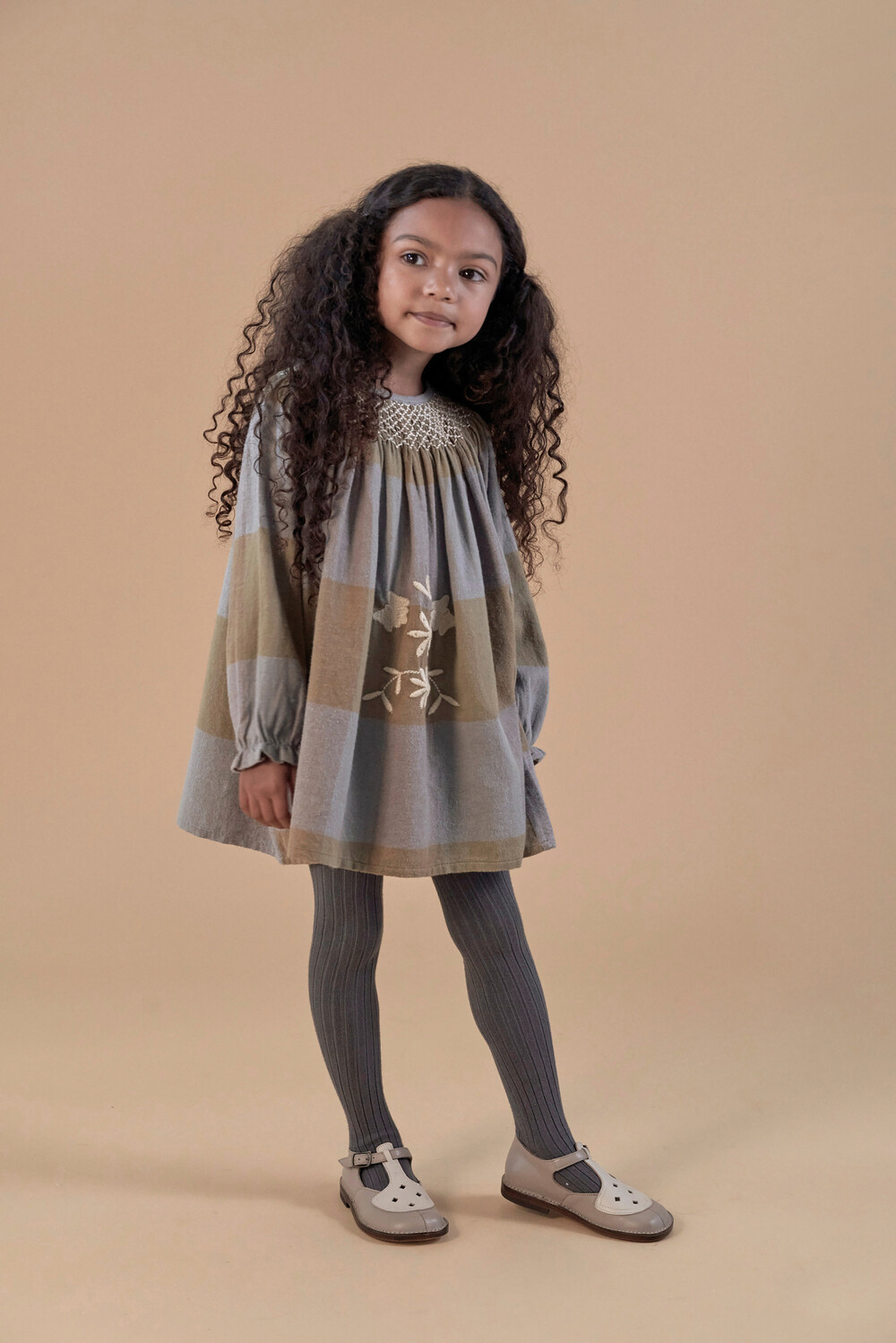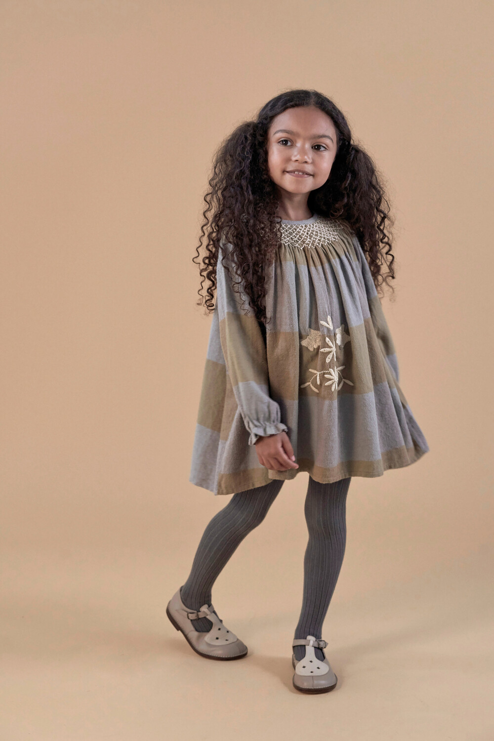 A favourite Apolina style, the Sissy dress has a sweet retro smock silhouette, intended to be worn short and ‘doll-like’. The special brushed blanket check in ‘sage’ makes this the perfect cosy winter dress with a soft, flannel style hand feel. Featuring contrast cream embroidery at front skirt and hand smocking to neckline. Button closure to back.