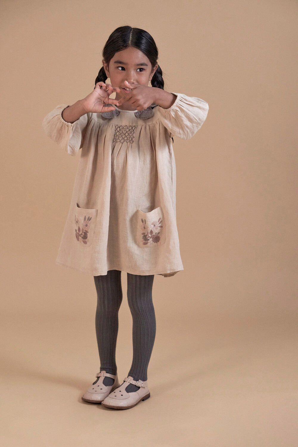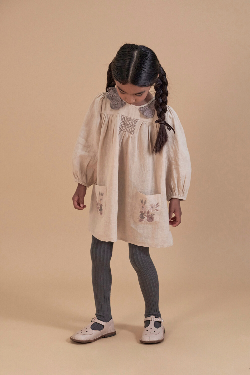 Viola is a dreamy winter dress with a relaxed, easy to wear silhouette. Her contrasting ‘charcoal’ hand crochet collar, delicate chest hand smocking and embroidered pockets add a special mood to this comfy dress. Invisible zip closure to back. We love Viola layered with cosy ribbed tights.