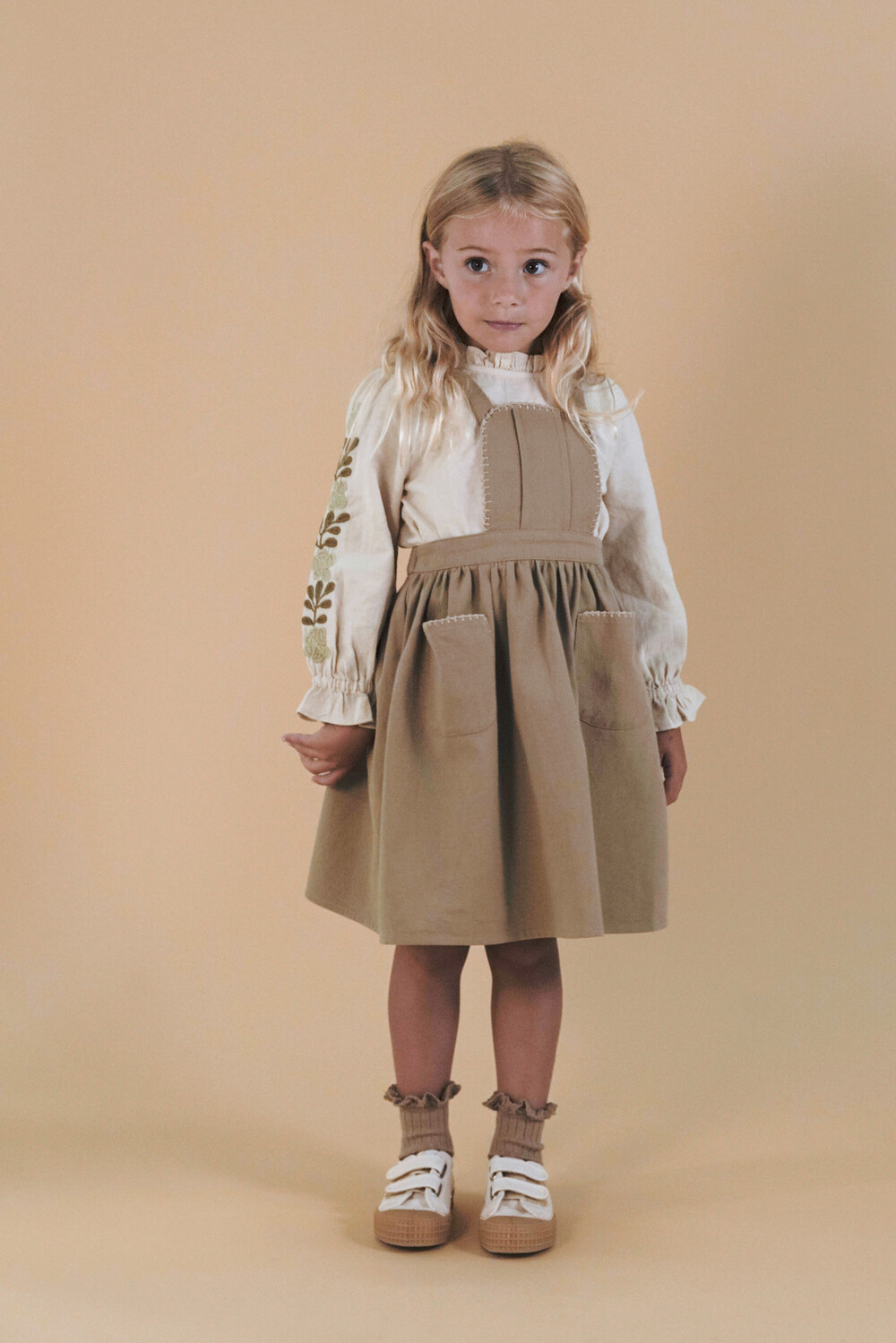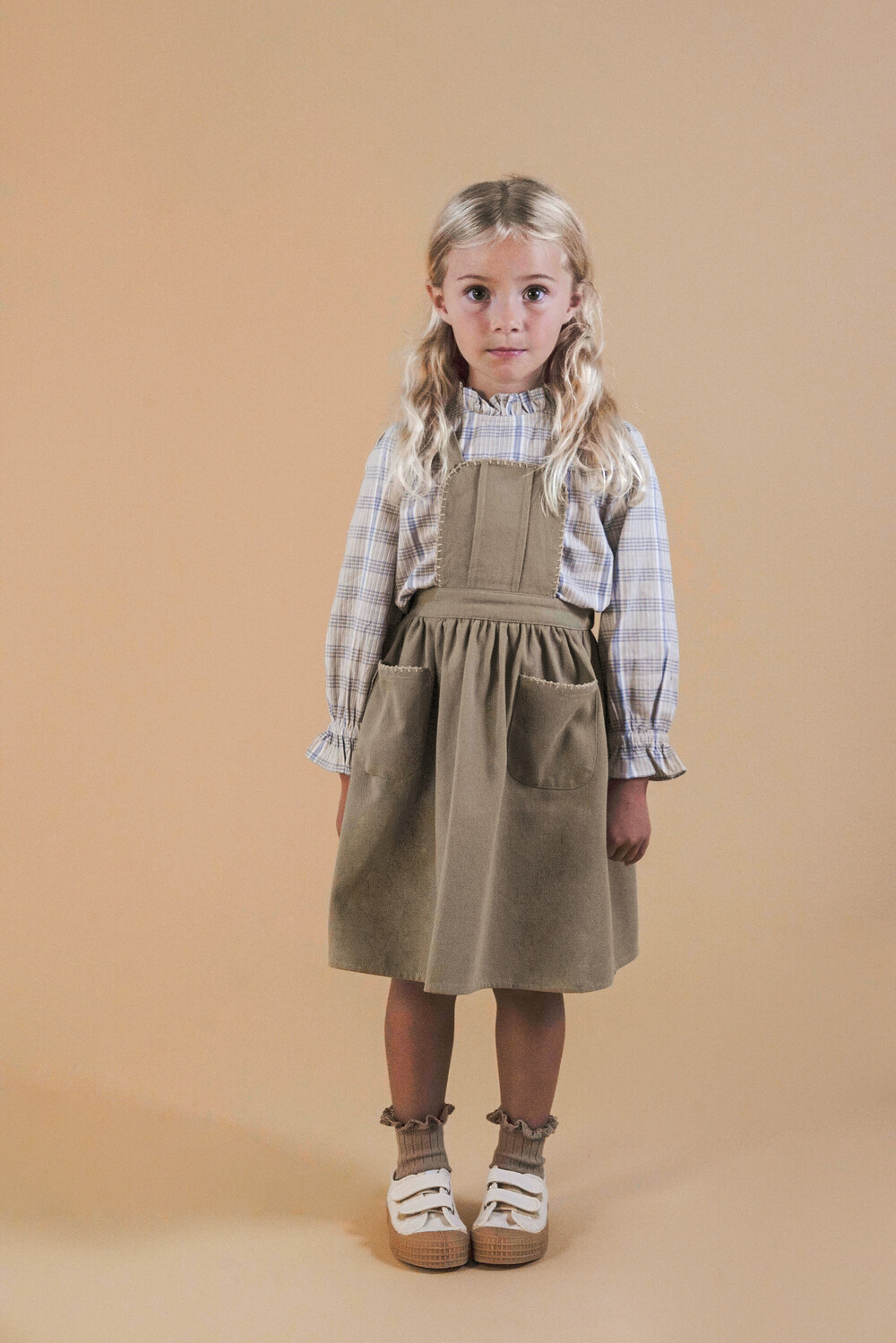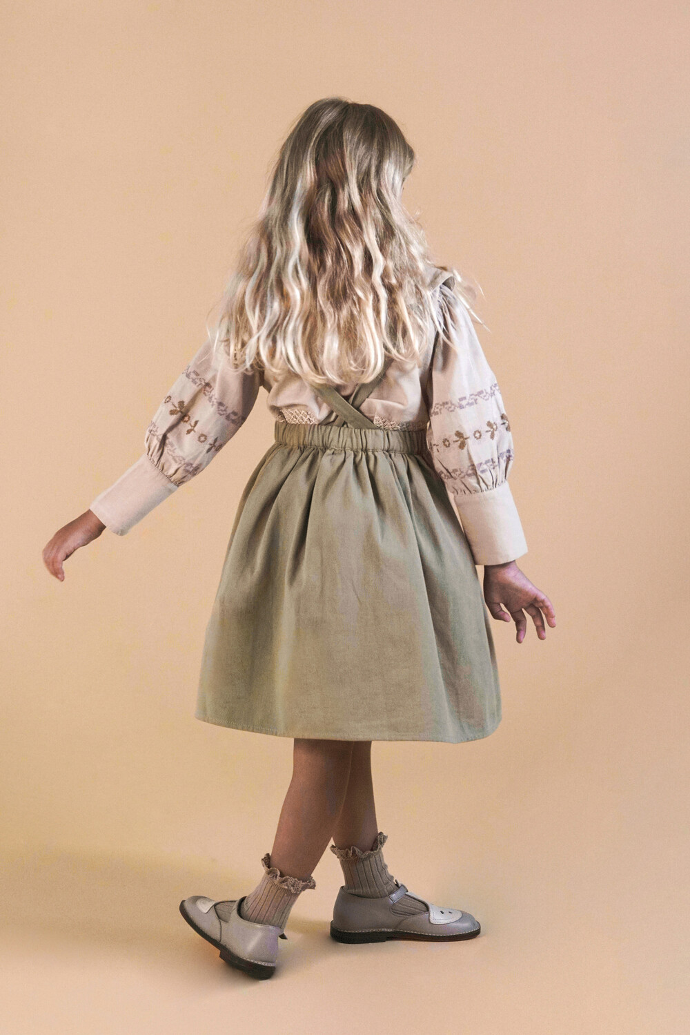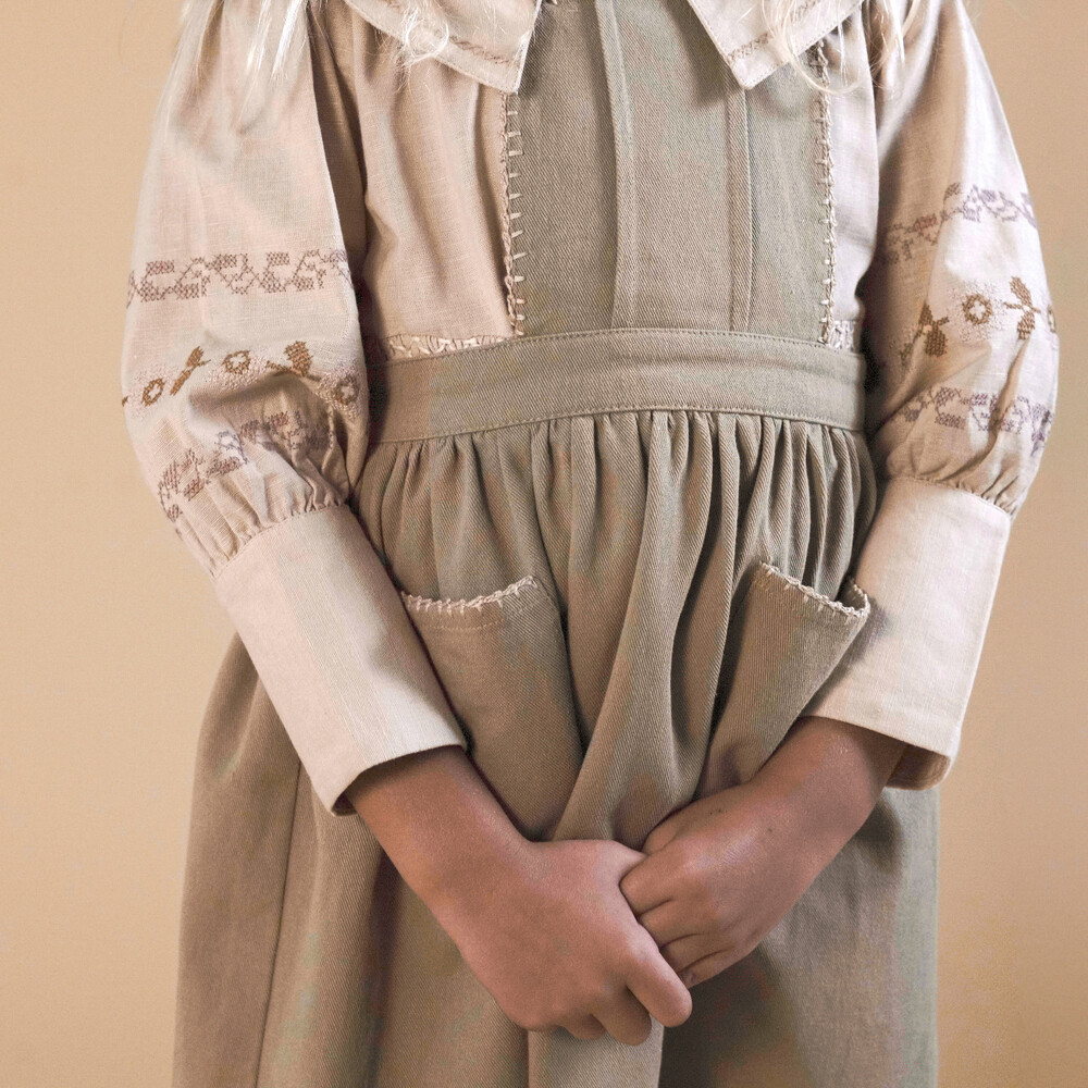 Lena is our ultimate everyday pinafore. In a beautiful sage heavy cotton twill, Lena is completely practical and easy to wear all season long, whether adventuring outdoors or playing indoors. Featuring a contrasting cream hand crochet trim to the bib and pocket tops. Invisible zip closure to back waist. Lena pairs perfectly with our Priscilla and Prudence blouses.