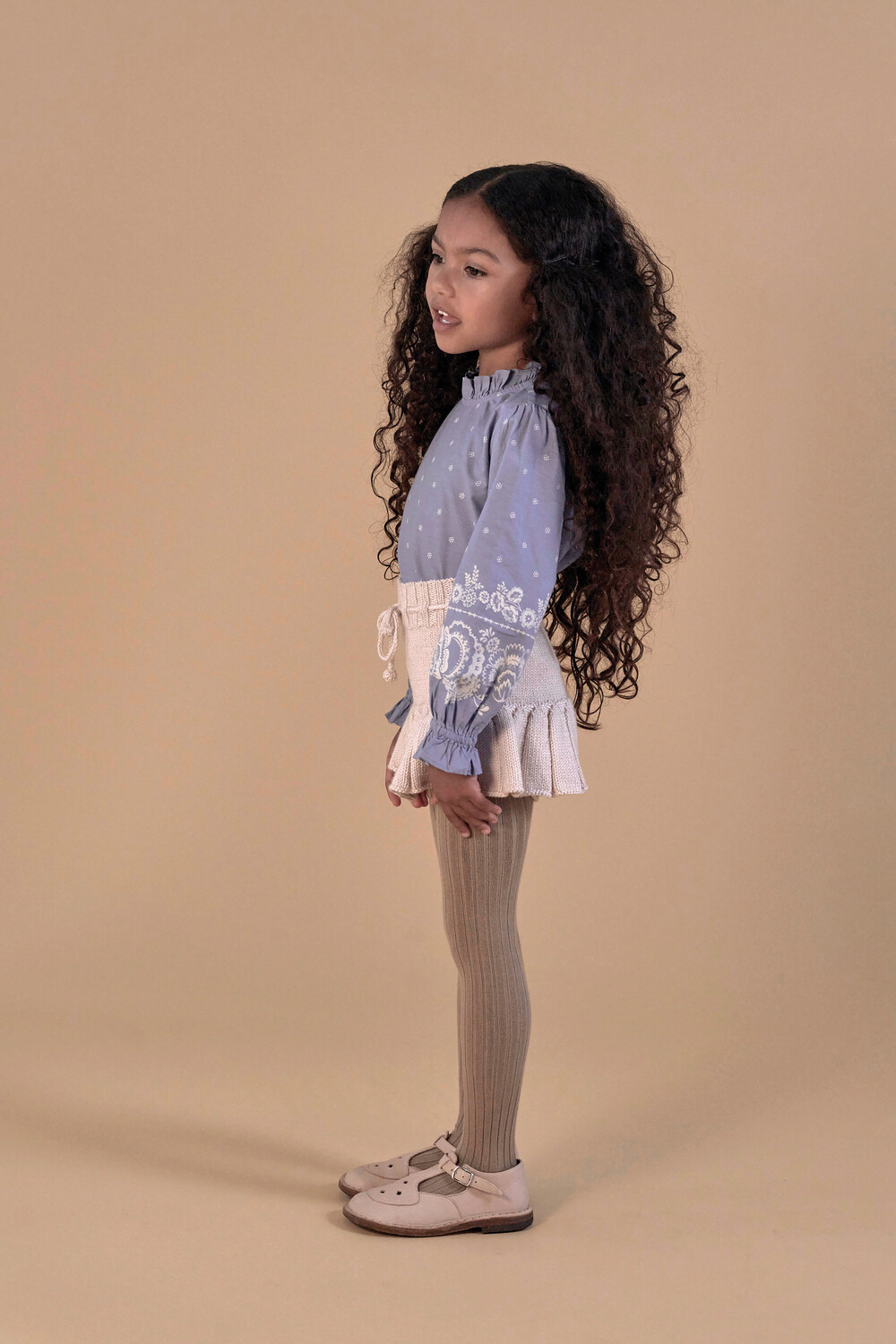 The sweet Prudence top is a perfect layering piece, in our signature textiles of the season. Our bandana floral print adds a bohemian touch, and her dramatic border print sleeves make a statement. Featuring a scoop neckline trimmed with a soft ruffle and button back fastening. Prudence is comfortable and so easy to wear. We love her layered with our Lena pinafore and Erma skirt.