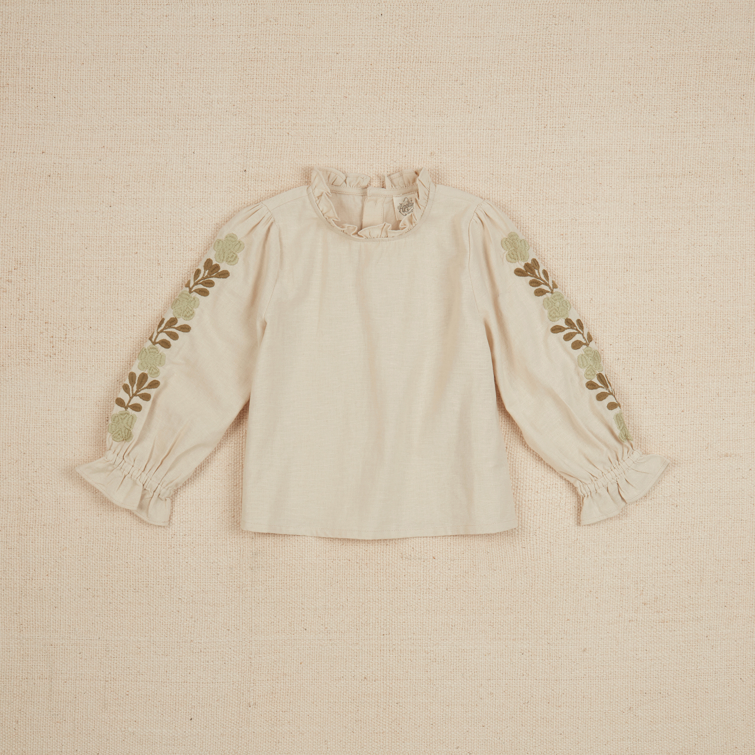 The sweet Prudence top is our perfect layering blouse, crafted from cream rustic cotton, with pretty embroidery detail to the sleeves in vintage pale pear and sage tones. Featuring a scoop neckline trimmed with a soft ruffle and button back fastening. Prudence layers beautifully with dungarees and pinafores, and we love her styled simply with casual leggings.