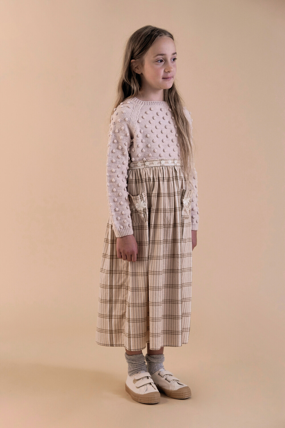 Erma is an easy midi skirt in our soft-toned ‘melba’ farm check. Embroidered floral motifs in cream trim the waistband and decorate the pockets. Featuring an elasticated back waist with fixed front band. Intended to sit at the natural waist position with knits tucked in, Erma is lovely layered with knits and worn over leggings for a casual relaxed look. Little ones will love the ‘grown up’ feel of this pretty skirt.