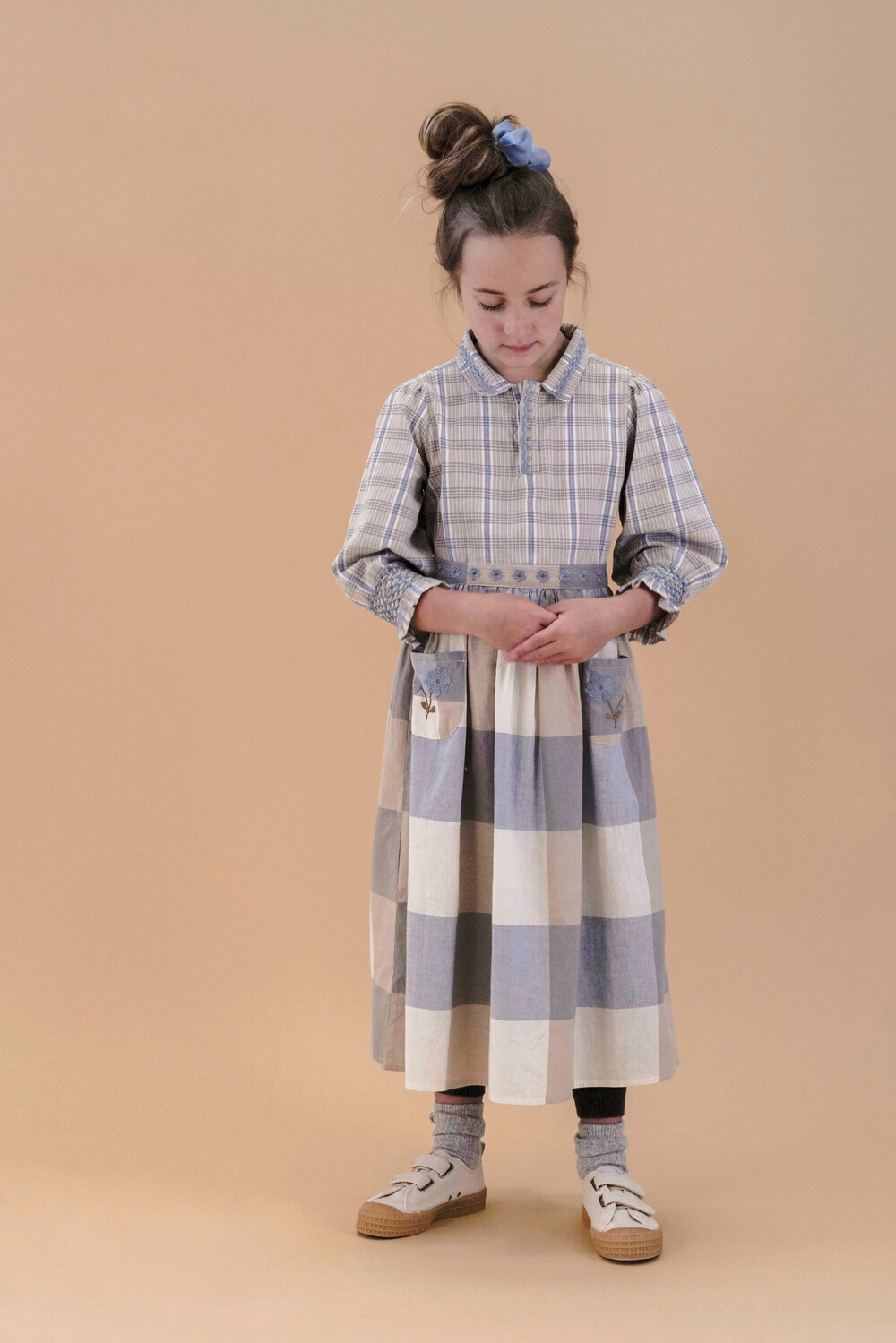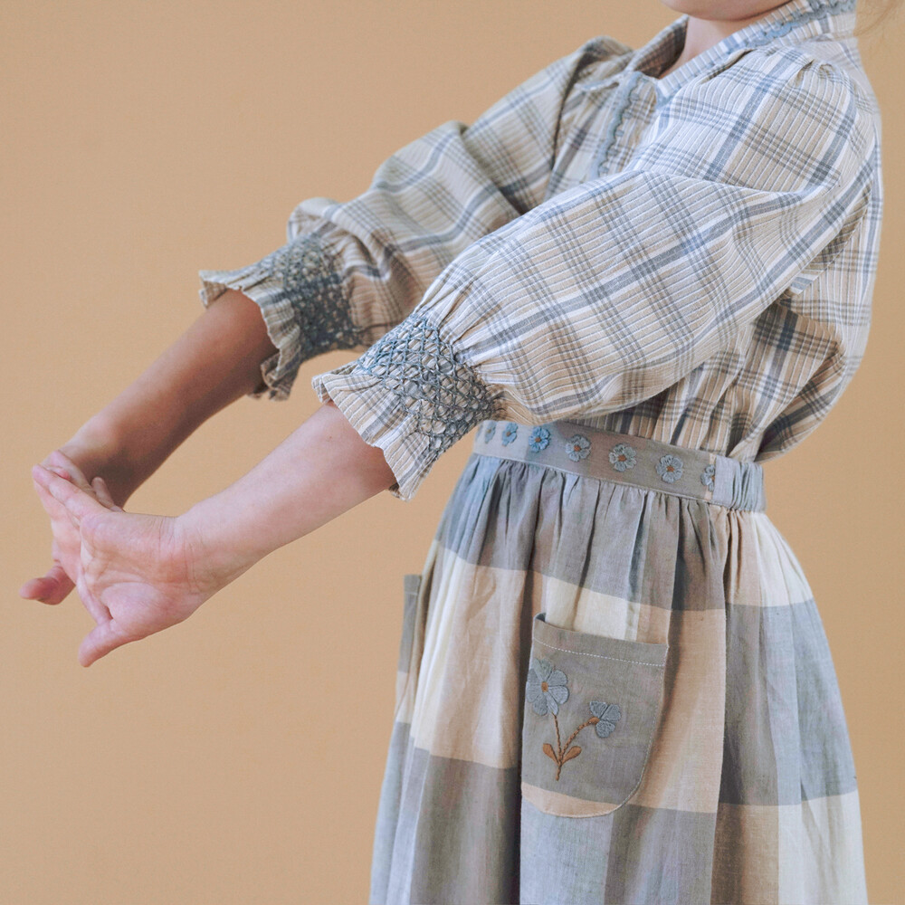 With a prairie influence, our Erma set perfectly pairs our much-loved Buffy blouse with our Erma skirt. We love the mix and match checks of these two pieces together. Embroidered floral motifs trim the waistband and decorate the pockets, while simple linear embroideries trim the blouse collar and button placket. Erma has an elasticated back waist with a fixed front band, intended to sit at the natural waist with blouse tucked in. Little ones will love the ‘grown up’ feel of this pretty skirt set.