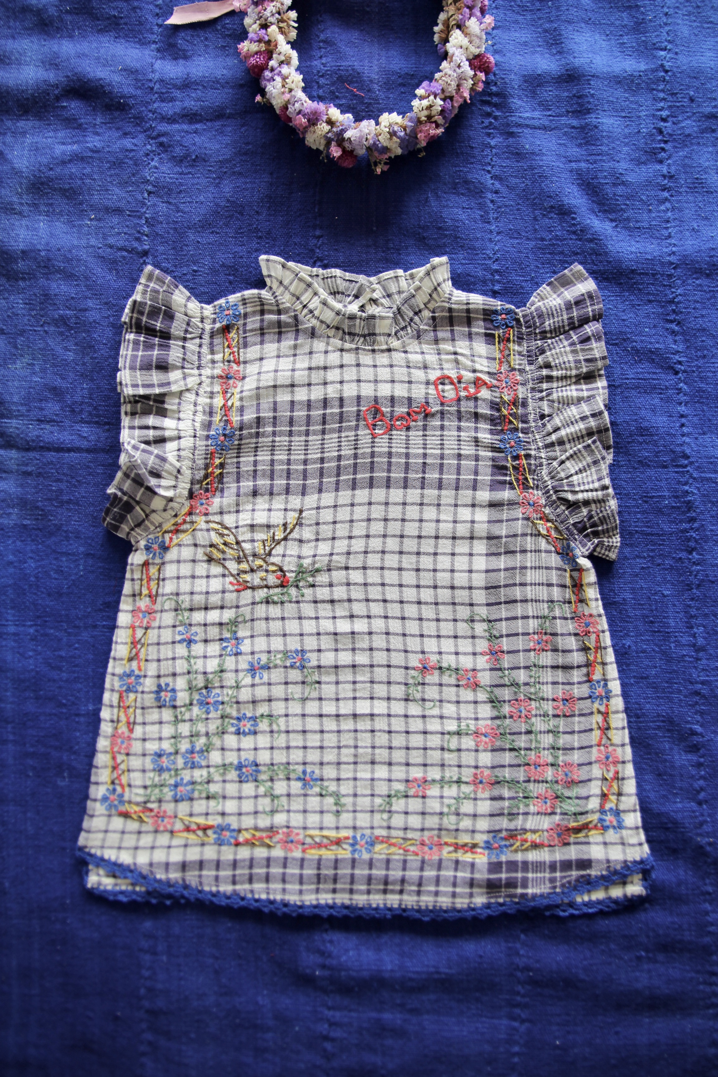 Top with flounce and embroidery_Handkerchief check_Bonjour