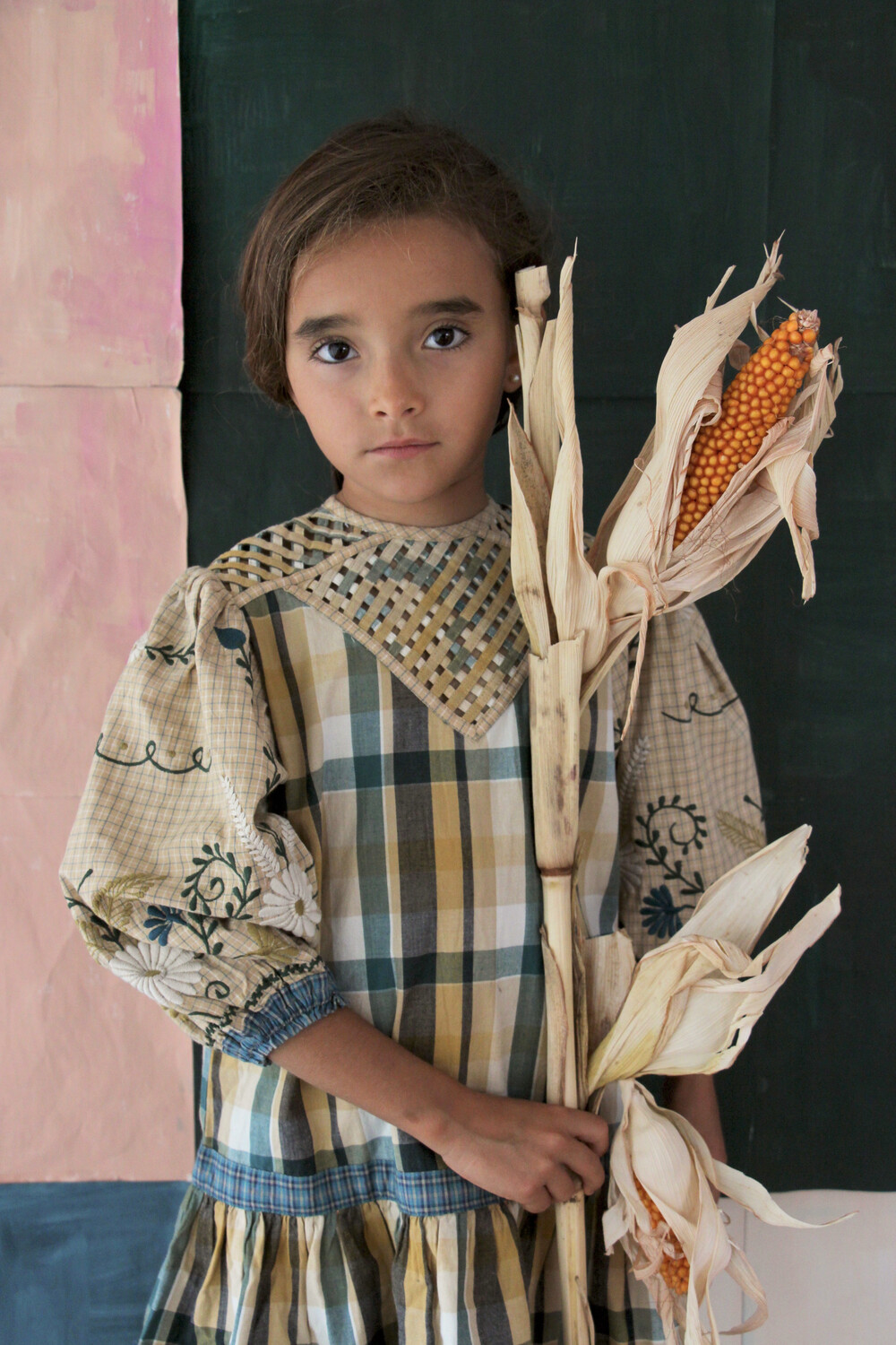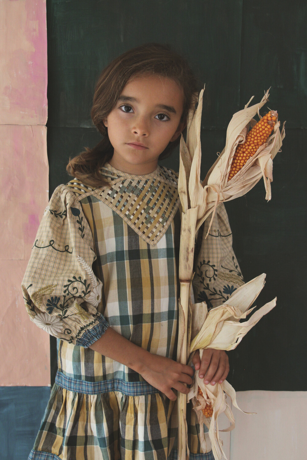 Folk dress with braid top & embroidery_Big green check_Bonjour